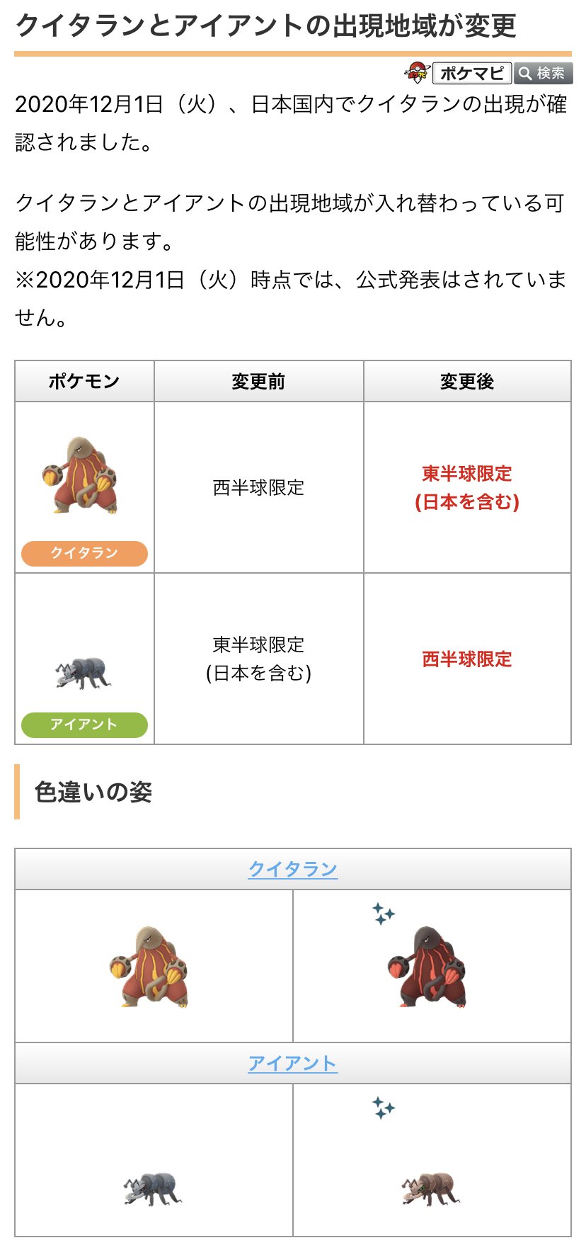 ポケモンgo攻略情報 ポケマピ 本日 12 1 火 より 西半球の地域限定ポケモンだったクイタランが 日本国内でも出現していることが確認されています クイタランとアイアントの出現地域が入れ替わっている可能性があります T Co 6v29c3ovxl